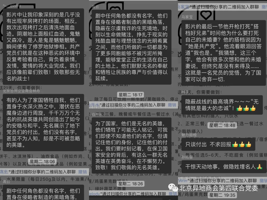 观影后组织了座谈交流,大家畅所欲言,还纷纷在微信群里留言,表达了对日本侵略者的愤怒谴责和对“无名英雄”的崇敬之情。