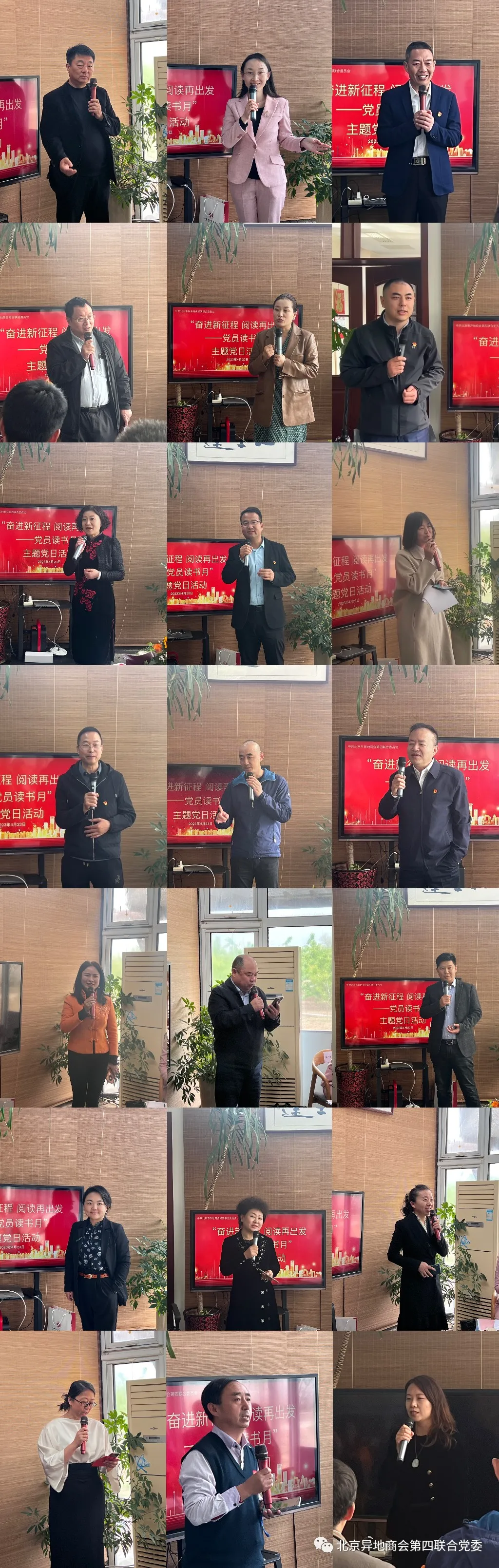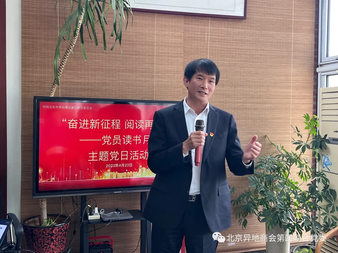 四月春恰好,读书正当时。为庆祝第28个“世界读书日”,倡导全体党员开展阅读、分享活动,培养全体党员阅读习惯,加强党性修养,全面推动学习型联合党委建设,4月23日,北京市异地商会第四联合党委(以下简称“第四联合党委”)在北京凤凰岭山脚下的心在途庄园,组织开展了“奋进新征程 阅读再出发——党员读书月”主题党日活动,第四联合党委所属北京浙江企业商会、北京九台企业商会、北京陕西企业商会、北京内蒙古企业商会、北京新疆企业商会、北京重庆企业商会、北京吉林企业商会、北京宁波企业商会、北京嘉兴企业商会、北京金华企业商会、北京呼伦贝尔企业商会、北京义乌企业商会、北京遵义企业商会、北京铜仁企业商会、北京苍南企业商会等20余家在京异地商会近百名党员、会员企业家线上线下参加,党委书记吴中强出席。本次读书会活动由北京九台企业商会承办,北京铜仁企业商会党支部书记、清华大学博士后罗丹阳主持。